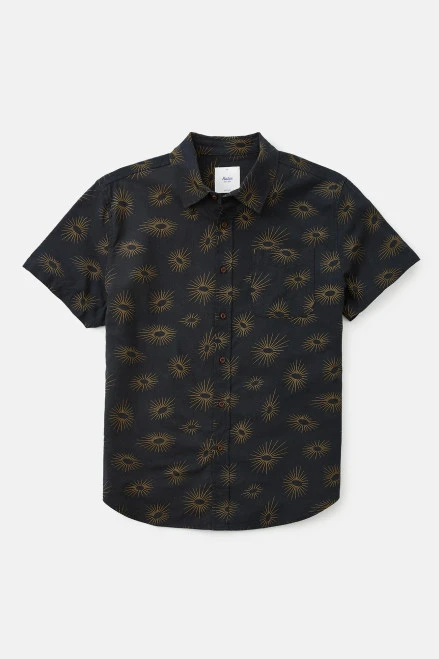 The Satellite Shirt features a custom burst print atop a breathable cotton/linen button-up woven shirt.