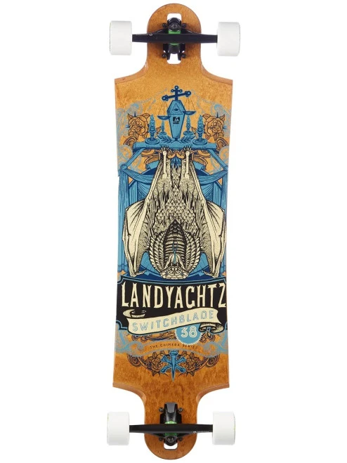LANDYACHTZ SWITCHBLADE 38″ COBRA BAT COMPLETE The Switchblade has been a go-to board for anyone looking to push the freeriding envelope. Drop through mounting, drop foot platform and cut out to prevent wheelbite, what more do you?! Oh yeah, three different sizes to specifically match your board preference. Perfectly at home on steep hills or navigating your way to the store. The Switchblades got you covered. 38″ Length I 9.8″ Width I 29″ Wheelbase Symmetrical, Drop mounted, Drop down freeride design 100% Canadian Maple Landyachtz is committed to planting one tree for each board that is purchased.