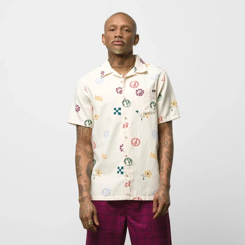 Peace, Love, and Vans. The In Our Hands Woven Shirt spreads the positive message with an allover print featuring symbols of peace and planet earth. Made with 80% organic cotton and 20% linen, this short sleeve oxford buttondown shirt is finished with a classic pocket at left chest. Model is 6 feet tall and wearing a size Medium.